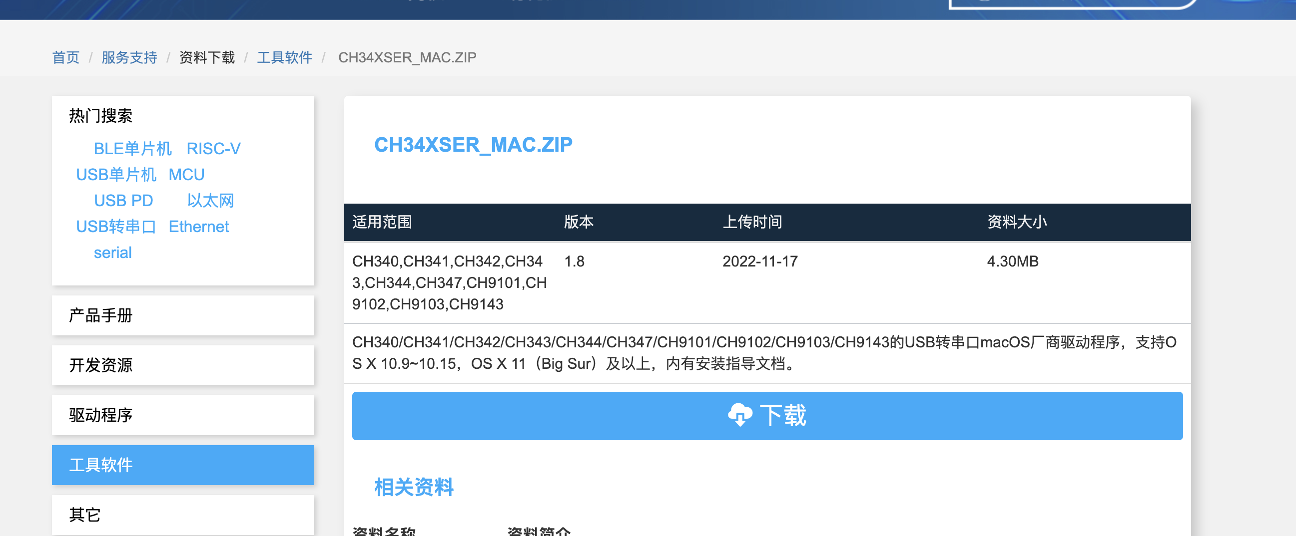 从官网下载 https://www.wch.cn/downloads/CH34XSER_MAC_ZIP.html 下载对应驱动,进行安装